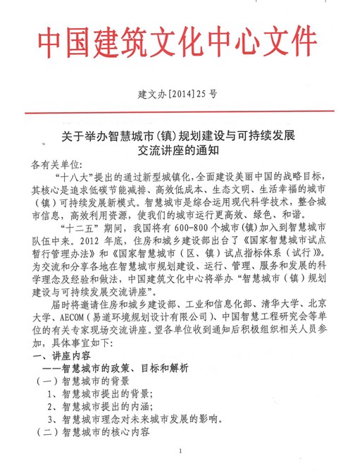中国建筑文化中心 《关于举办智慧城市(镇)规划建设与可持续发展交流讲座的通知