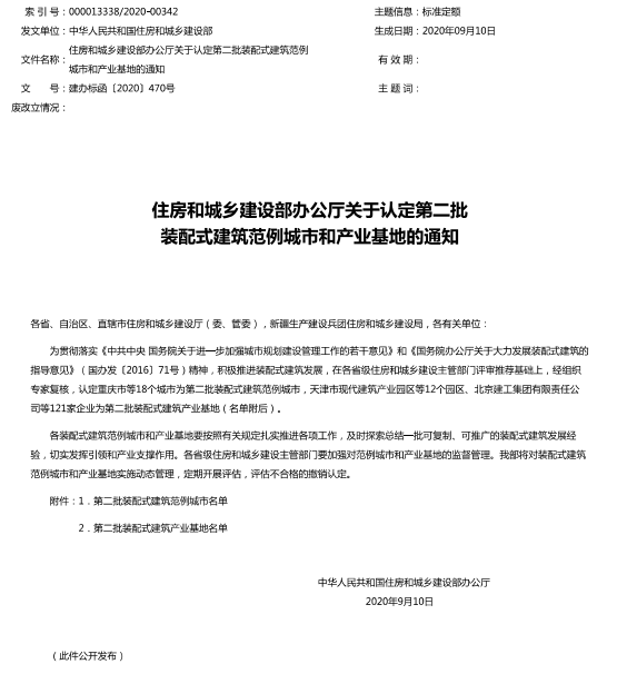 9月10日,住房和城乡建设部办公厅发布《关于认定第二批装配式建筑范例城市和产业基地的通知》(建办标函〔2020〕470号),我省吉首市入选第二批国家装配式建筑范例城市,湖南宁远工业园区入选第二批国家装配式建筑园区类产业基地,湖南建工集团有限公司、五矿二十三冶建设集团有限公司、中国水利水电第八工程局有限公司、中机国际工程设计研究院有限责任公司、湖南武陵山四维住工集团有限公司等5家企业入选第二批国家装配式建筑企业类产业基地!新一批入选单位在全国激烈竞争评选中凯旋而归,再次彰显了我省装配式建筑产业实力!