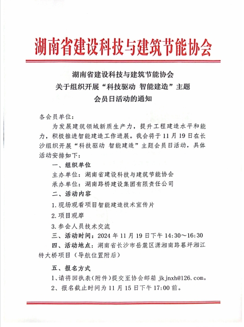 各会员单位: 为发展建筑领域新质生产力,提升工程建设领域建造水平和能力,积极推进智能建造工作进展。我会将于11月19日在长沙组织开展“科技驱动 智能建造”主题会员日活动,具体活动安排如下: 一、组织单位 主办单位:新利体育全站 承办单位:湖南路桥建设集团有限责任公司 二、活动内容 1.现场观看项目智能建造技术宣传片 2.项目观摩 3.参会人员技术交流 三、活动时间:2024年11月19日下午14:30~16:30 四、活动地点:湖南省长沙市岳麓区潇湘南路暮坪湘江特大桥项目(导航位置附后) 五、报名方式 1、请将回执表(附件)提交至协会邮箱jkjnxh@126.com。 2、报名截止时间为11月15日下午17:00前。 六、其他事项 1、本次活动为会员日活动,仅限协会会员单位报名参加,本次活动不收取任何费用,名额有限,员满即止。 2、请各参加人员自行驾车(车辆可停放至项目入口停车场)、乘车前往活动地点。导航位置如下: