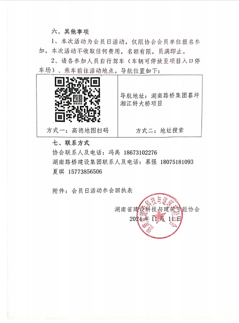 七、联系方式 协会联系人及电话:冯禹 18673102276 湖南路桥建设集团联系人及电话:慕强 18075181093夏琪 15773856506